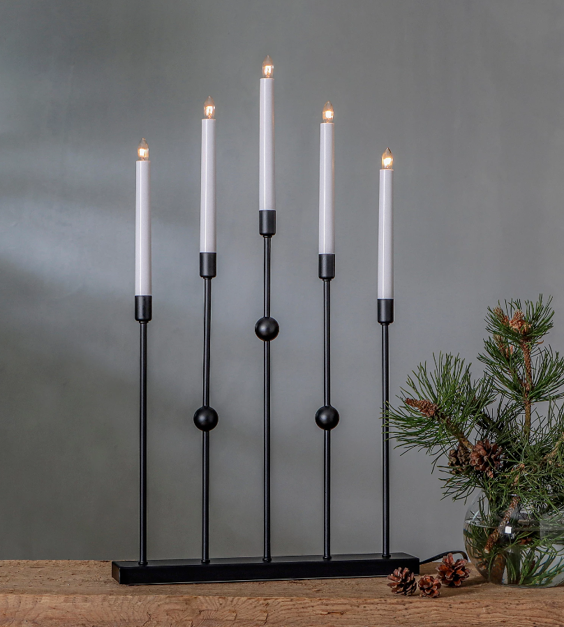 Stilrent i svart, fint att para ihop med en minimalistisk inredning, men det är också en färg som passar fint i hop med juligt rött och grönt. Just den här adventsljusstaken har fem ljusarmar med tre dekorativa sfärer i olika nivåer. Om svart inte är din melodi finns ljusstaken även i krom.