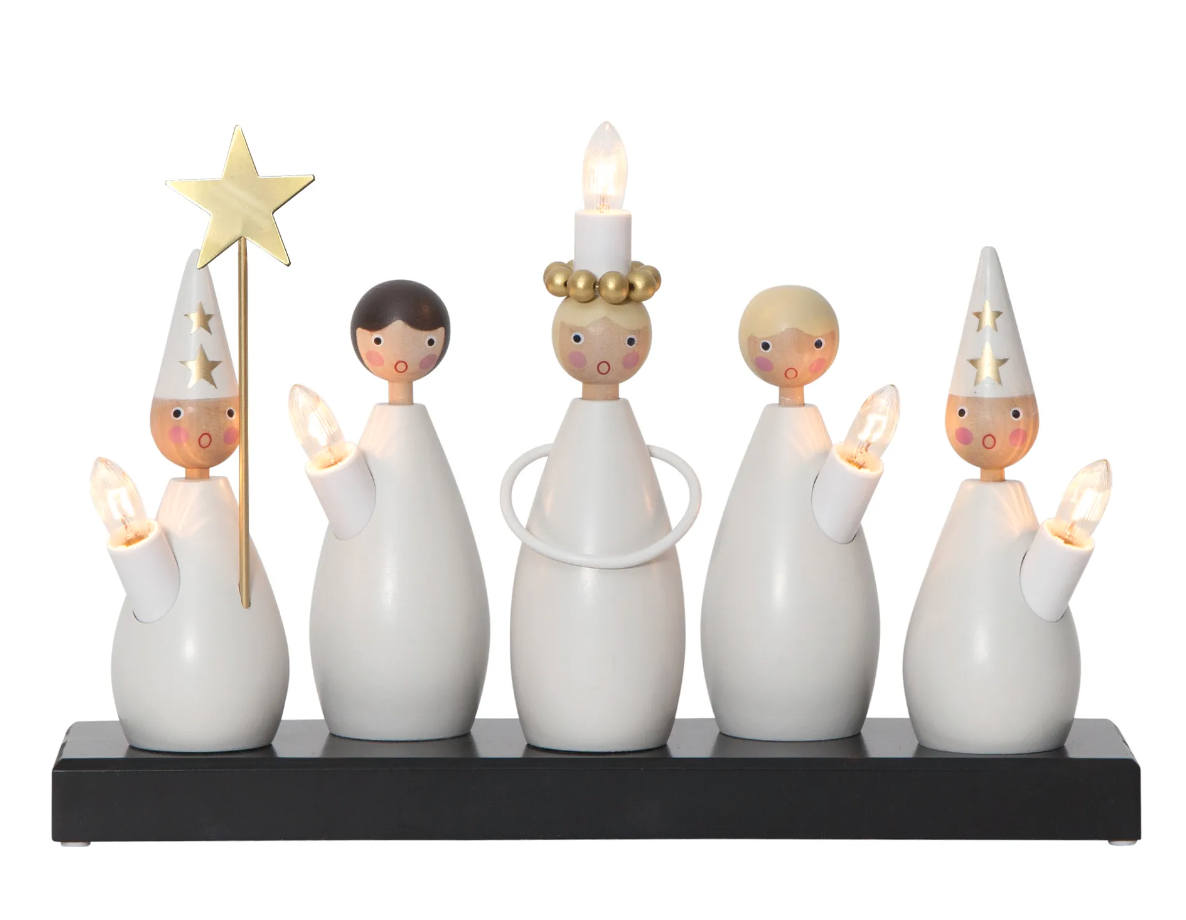 Den här lilla söta luciakören har blivit otroligt populär de senaste åren. Ljusstaken kommer från Star Trading och är tillverkad i trä. De snidade figurerna består av tomtenissar, tärnor och en lucia som sjunger. Alla figurer har en egen ljuskälla med ett varmt sken. Adventsljustaken gör sig lika bra på köksbordet som i fönstret. Urgullig!