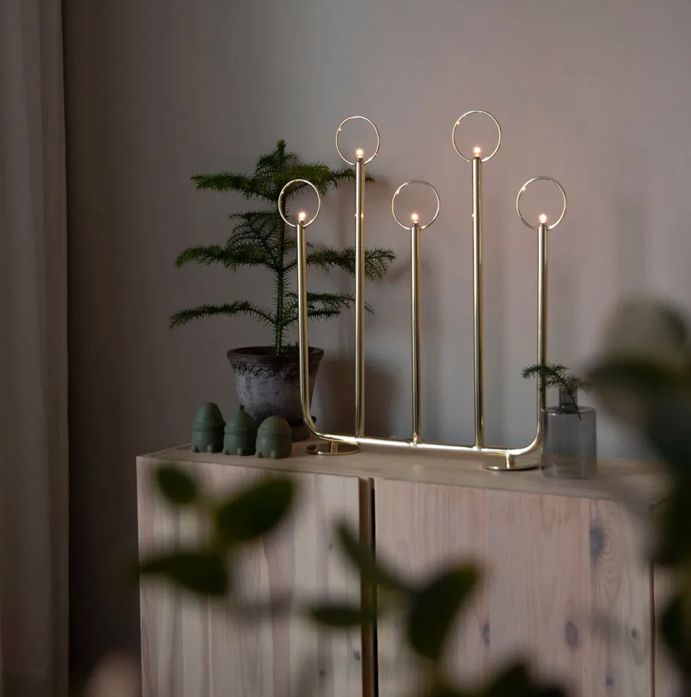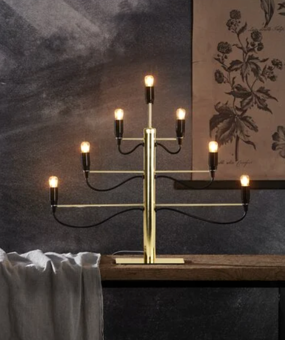 Om du vill ha en mer industriell inredningsstil hemma finns det faktiskt en del julpynt som kan passa in. Som den här adventsljusstaken från Star Trading. Ljusstaken har sju ljuskällor på en bas i mässing med svarta, grövre sladdar för att verkligen få till en lite mer ”rå” känsla.