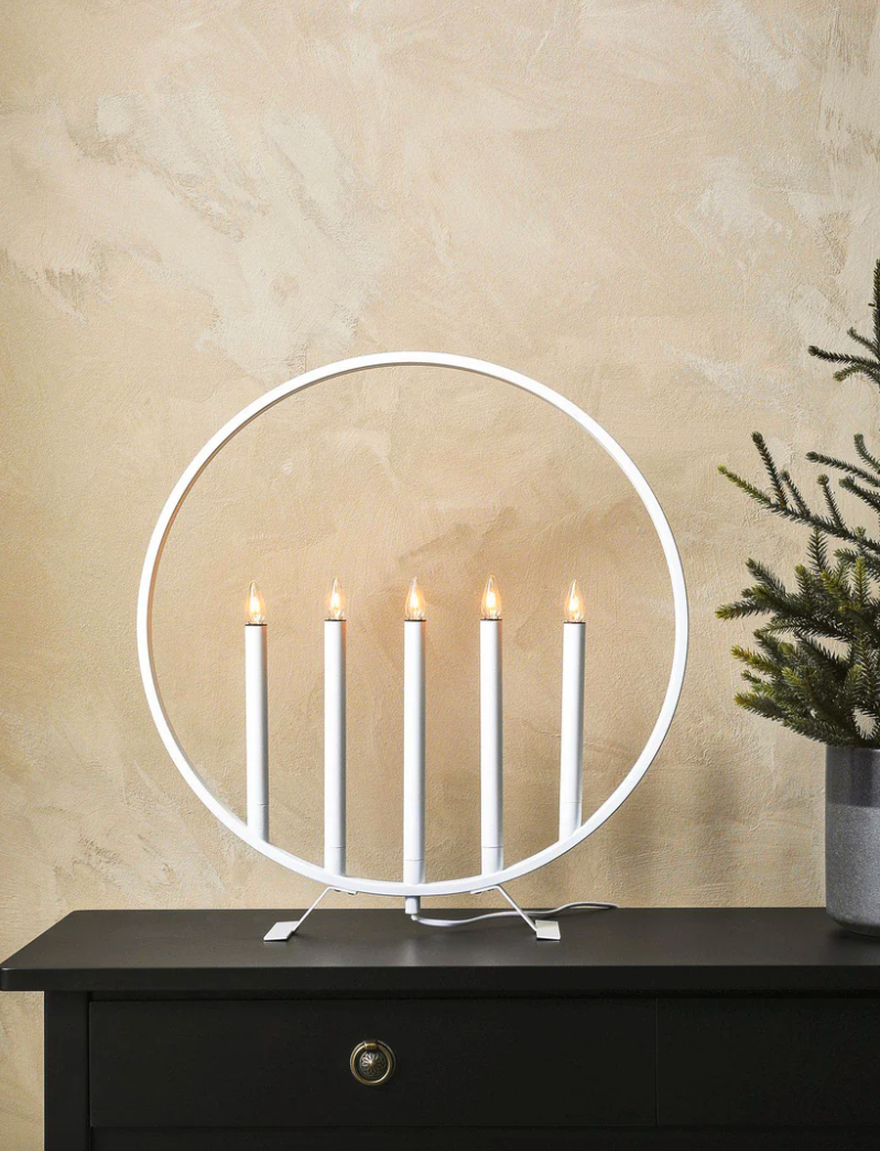 Vill du ha en mer modern ljusstake kanske en rund kan vara något för dig? Den här adventsljusstaken är gjord i vit metall och har fem stycken ljusarmar som omges av en rundad båge. Den här adventsljusstaken är ett fint tillskott till inredningen, och kan faktiskt stå framme året om.