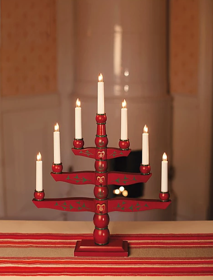 För mig är den här ljustaken så klassisk jul som det kan bli. Versioner av denna stod överallt hemma hos min mormor och morfar, och det blir därför ett kärt tillskott till min juldekor. Ljustaken är gjord i trä och har sju ljus i olika nivåer. Det vackert målade mönstret ger en lantlig känsla som för tankarna tillbaka till en riktig Carl Larsson jul.
