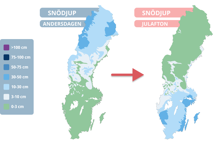 Årets Andersdag är ett tydligt exempel på det som vi pratat kring tidigare i artikeln. Att julen slaskar (kanske inte ger barmark, men riktigt mildväder) i norra Sverige samtidigt som julen braskar (med kyla och en hel del snö) i söder är högst osannolikt.