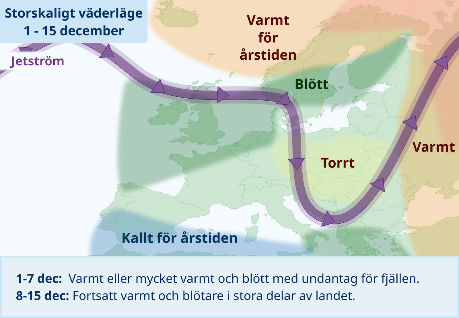 UPPDATERING: Vi befinner oss nu i ett betydligt varmare läge under den inledande perioden med varmt eller mycket varmt för årstiden. Från vecka 51 går vi åt mer normala värden, med undantag för längst i norr. Vecka 52 omkring normalvarmt, men osäkert.