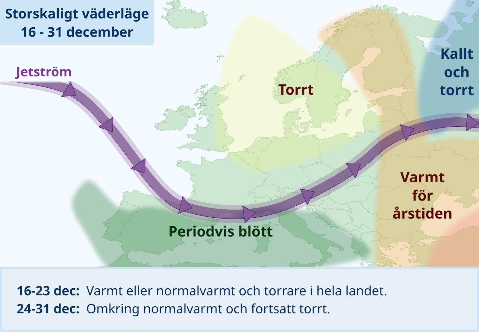 Avslutande period: Nya kalluftsutbrott är möjliga under vecka 51-52, där vi samtidigt ser torrare väder över främst norra Europa. Varmt väder för årstiden ser samtidigt ut att kunna hålla i sig över de sydöstra delarna. En sydlig jetström kan även ge en blöt avslutning runt Iberiska halvön.