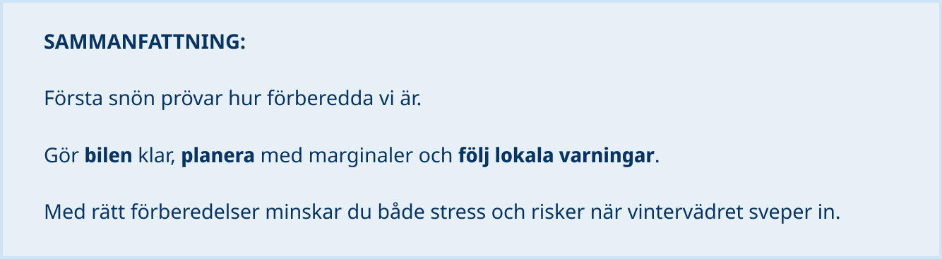 • Morgonpendling: Starta 15–30 minuter tidigare, håll dubbelt avstånd och välj huvudvägar som plogas först.