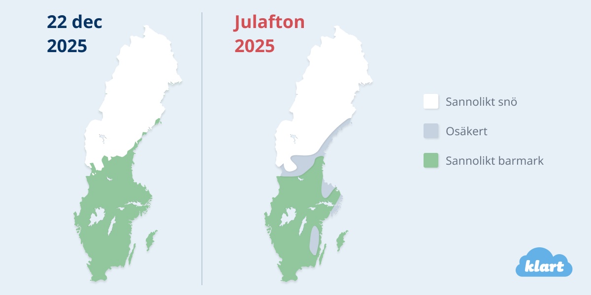 Hög sannolikhet råder i norr - mer specifikt så kan man förvänta sig snötäcke på julaftons morgon i Lappland, Norrbotten, Västerbotten - förutom lokalt vid kustlandet, Jämtlands län, västra Västernorrlands län - föutom närmast kusten, nordvästra Hälsingland samt nordligaste Dalarna.
