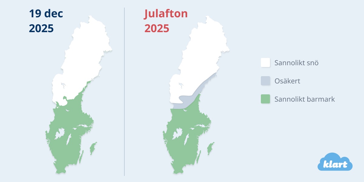 Hög sannolikhet råder i norr - mer specifikt så kan man förvänta sig snötäcke på julaftons morgon i Lappland, Norrbotten, Västerbotten - förutom kustlandet, Jämtlands län, västra Västernorrlands län, nordvästra Hälsingland samt nordligaste Dalarna.