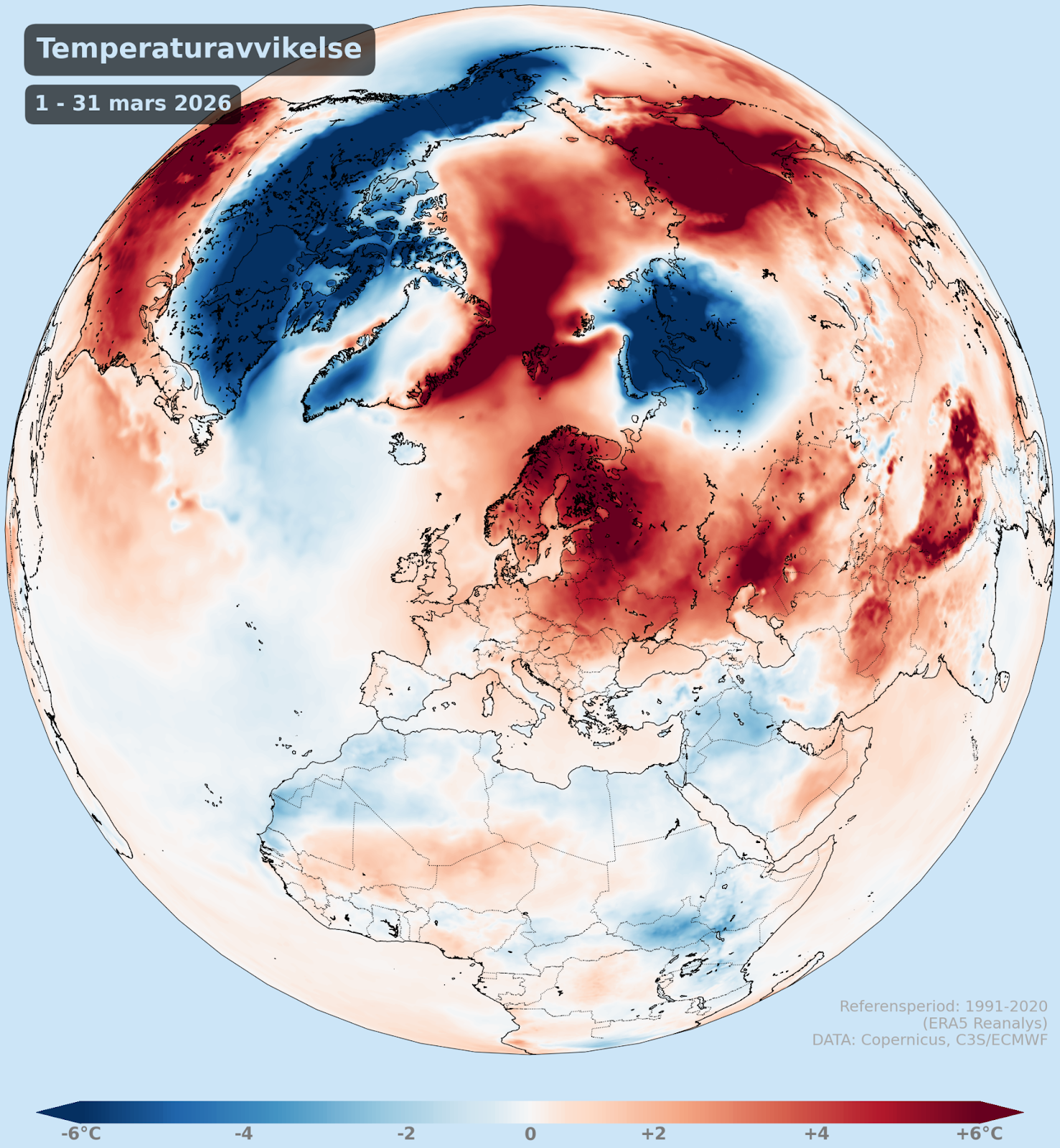 Med en global medeltemperatur på 13,94 grader och en avvikelse på 0,53 grader över normalperioden 1991-2020 placerar sig mars 2026, utifrån de preliminära Copernicus siffrorna, som den fjärde varmaste marsmånaden.
