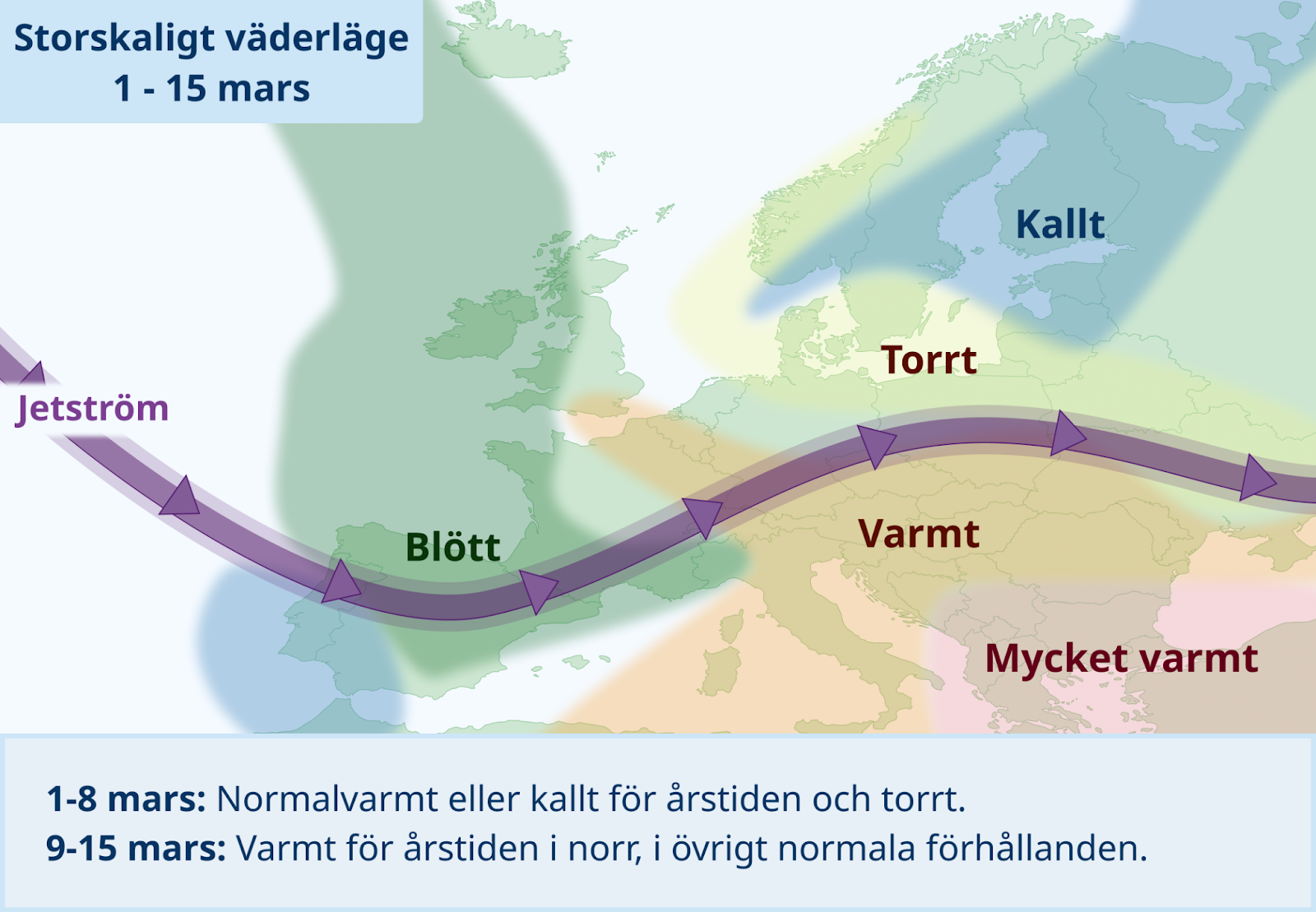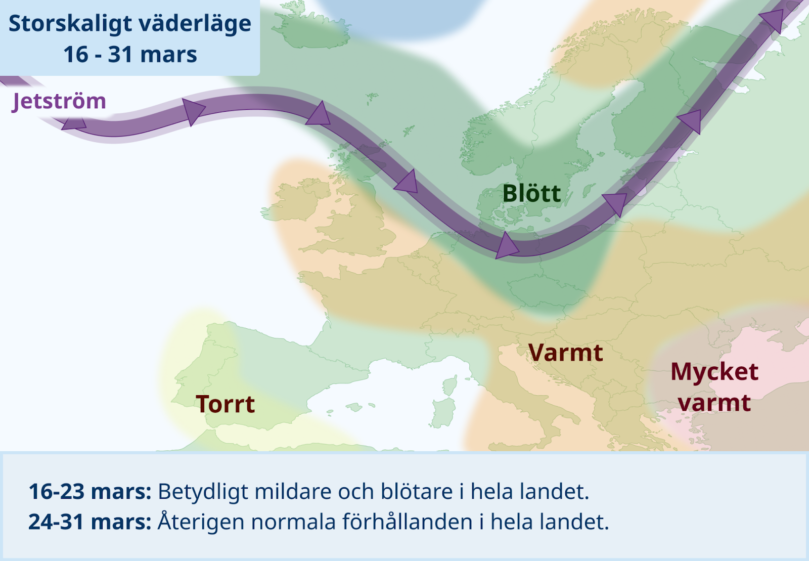 Avslutande period: Jetströmmen kan få en nordligare placering, där det blöta vädret förflyttas norrut över centrala och norra Europa runt vecka 12. Samtidigt ökar signalerna för torrare väder ner mot Iberiska halvön. Det finns dock stora osäkerheter och Sverige kan få en betydligt torrare avslutning av mars.