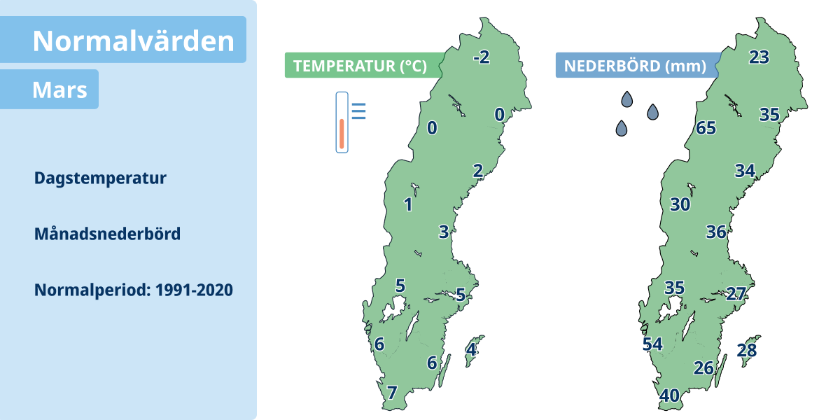 Norra Sverige: Vecka 10 ser ut att bli omkring normalt eller något kallare än normalt, men redan under vecka 11 väntas det istället bli något varmt för årstiden. Vecka 12–13 ser också ut att hamna kring det normala eller strax över, men snarare en “småmild” avslutning än en tydlig vårvärme.