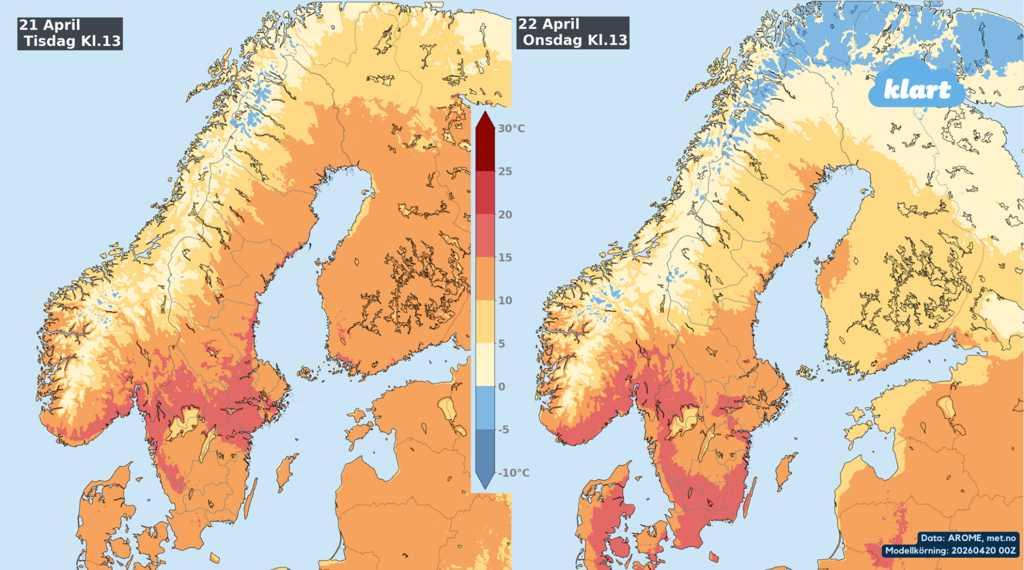 Tillsammans med mycket sol kan det räcka för att temperaturen lokalt ska nå upp till omkring 20 grader, främst i Mälardalen eller i delar av Sydsverige under tisdag och onsdag.