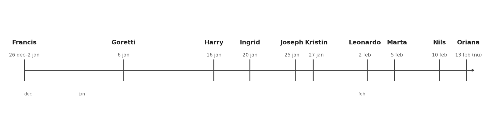 Francis (26 dec–2 jan) → Goretti (6 jan) → Harry (16 jan) → Ingrid (20 jan) → Joseph (25 jan) → Kristin (27 jan) → Leonardo (2 feb) → Marta (5 feb) → Nils (10 feb) →
