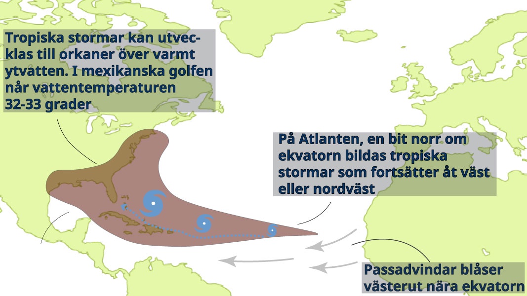 Varmt ytvatten är avgörande för att de tropiska stormarna ska växa sig större. Ytvattnet i stora delar av Atlanten har varit varmare än normalt sedan flera månader tillbaka. I mexikanska golfen är ytvattnet 30–32 grader vilket medför en risk för kraftiga orkaner att nå in över Västindien och USA.