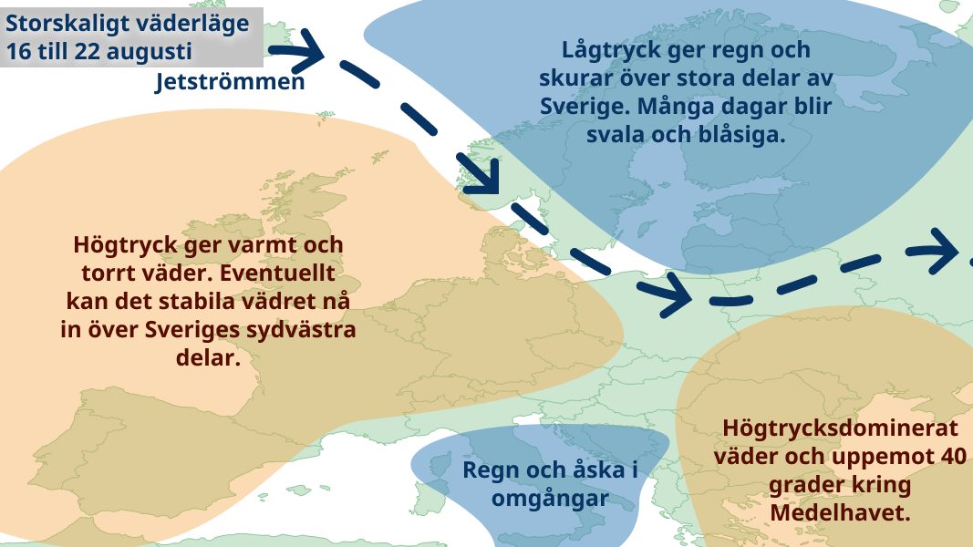 Det blir överlag en sval och blåsig vecka. Högtrycken väntas etablera sig över västra Europa och nordvästliga vindar sveper ner över Sverige. Trots lågtrycksdominerat väder i Sverige väntas inte några större regnmängder, utan den blir framförallt svalare än vad det varit tidigare under sommaren. I norr 10-15 grader och i söder 15-20 grader. Mot slutet av veckan väntas sol och dryga 20 grader över Götaland och kanske även Svealand när ett högtryck börjar etablerar sig över norra Europa.