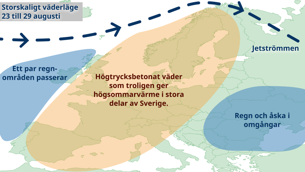 Högtryck ser ut att växa in över Sverige denna vecka och föra med sig varm luft när jetströmmen tvingas långt norrut. På många håll blir detta en vecka med sol och högsommarvärme, alltså uppemot 25 grader. Den exakta placering av högtrycket är dock något osäker och blir samtidigt avgörande för hur varmt det blir. Som lägst 20-25 grader med detta scenario.