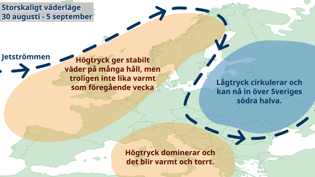 Det högtrycksbetonade vädret ser ut att fortsätta när vi går in i september, men det blir något svalare än föregående vecka. Högtrycket väntas framförallt bidra till att det blir torrt i Norrland, Dalarna, Värmland och på västkusten. I Östersjölandskapen kan däremot lågtryck nå in från Baltikum vilket ger skurar, moln och ett par svala dagar. Allmänt väntas temperaturen ligga på 15-20 grader i norr och omkring 20 grader i söder.