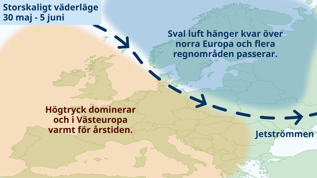 Det väntas svalt och lågtrycksbetonat väder i så gott som hela landet i början av juni. Nordvästliga vindar når in över landet och det blir många dagar med blåst, regn och moln. Största solchanser vid denna typ av väderläge är det vanligtvis längs Västkusten och ner över Skåne. I söder blir det 10-18 grader och i norr 0-10 grader, där Föhn-effekten kan bidrar till att det blir något varmare en eller ett par dagar.