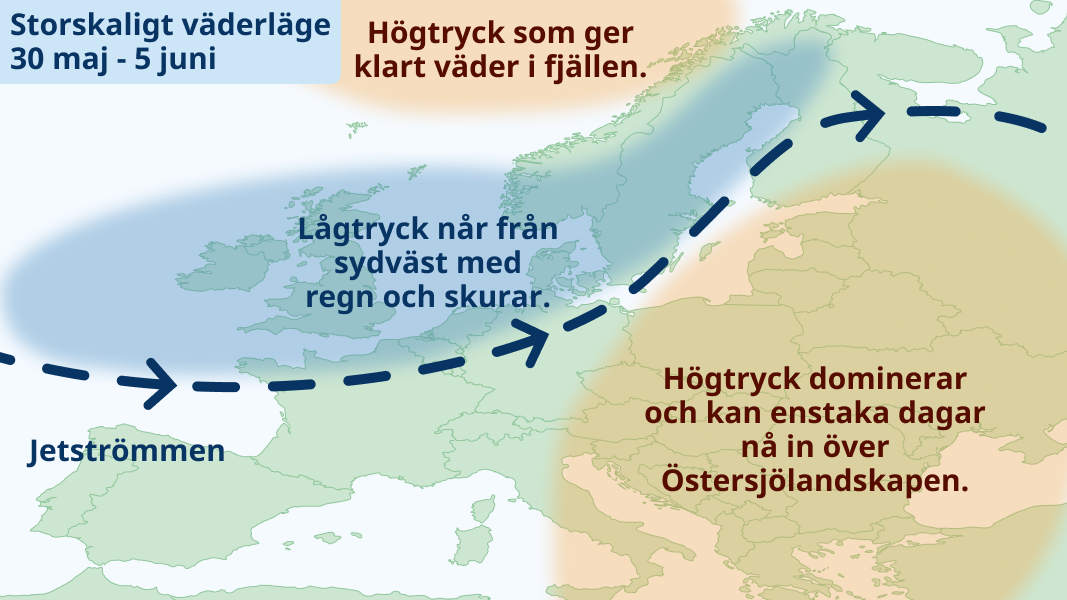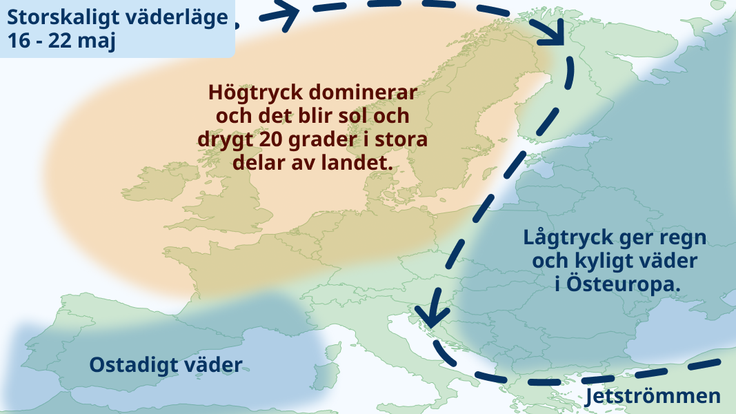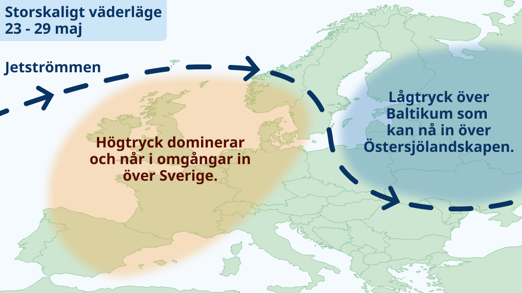 Högtryck etablerar sig över Skandinavien och det bjuds på mest klart väder i både söder och norr. Mycket varm luft når upp över landet och temperaturerna i söder kommer ligga på omkring 20 grader. I norr blir det 15-20 grader. Ett par dagar kommer det troligen bli närmare 25 grader i söder och den meteorologiska sommaren väntas ta ett stort kliv.