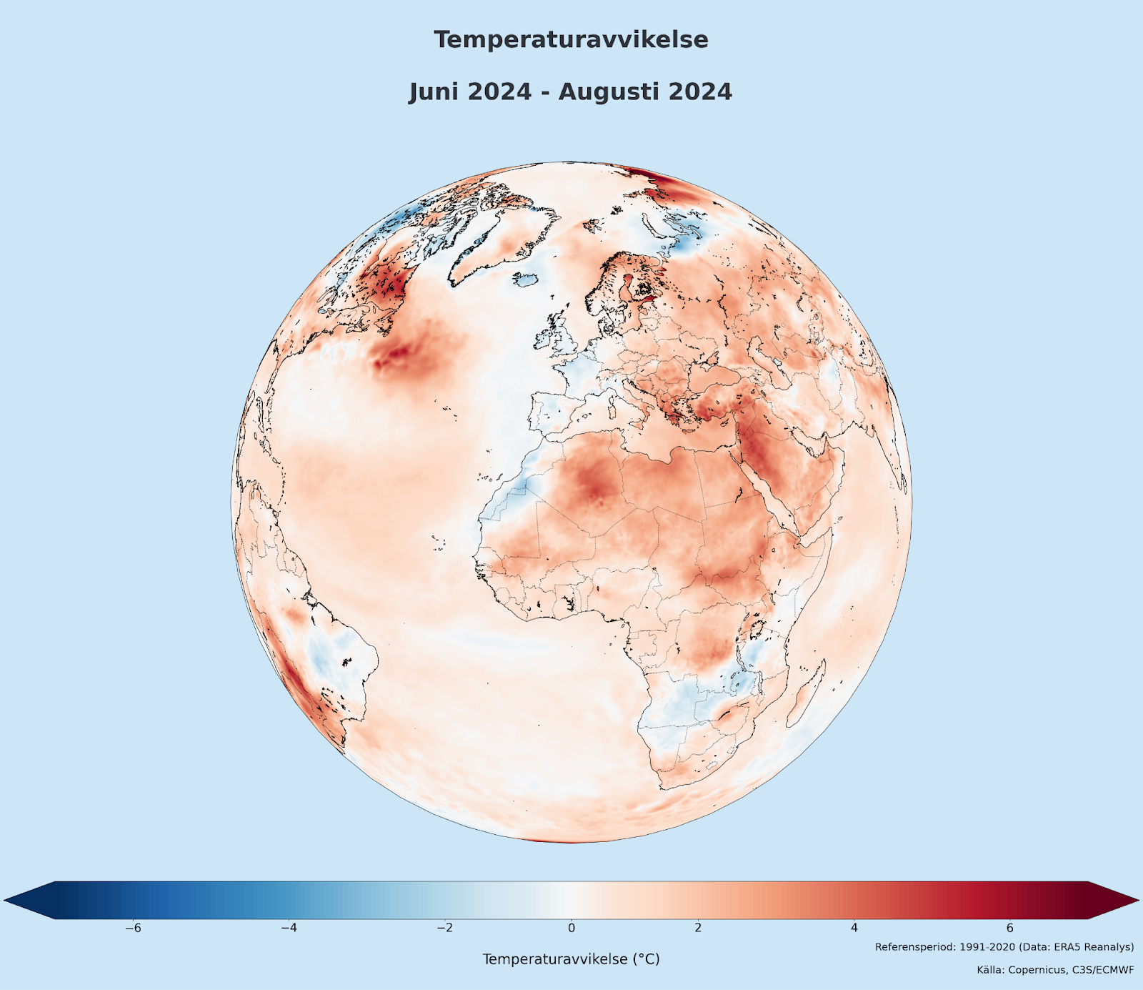 Enligt det europeiska klimattjänsten Copernicus var medeltemperaturen för perioden juni-augusti 0,69°C varmare än normalperioden 1991–2020, vilket slår det tidigare rekordet från 2023. I Europa var ökningen ännu mer påtaglig, där temperaturen låg hela 1,54°C över samma referensperiod.
