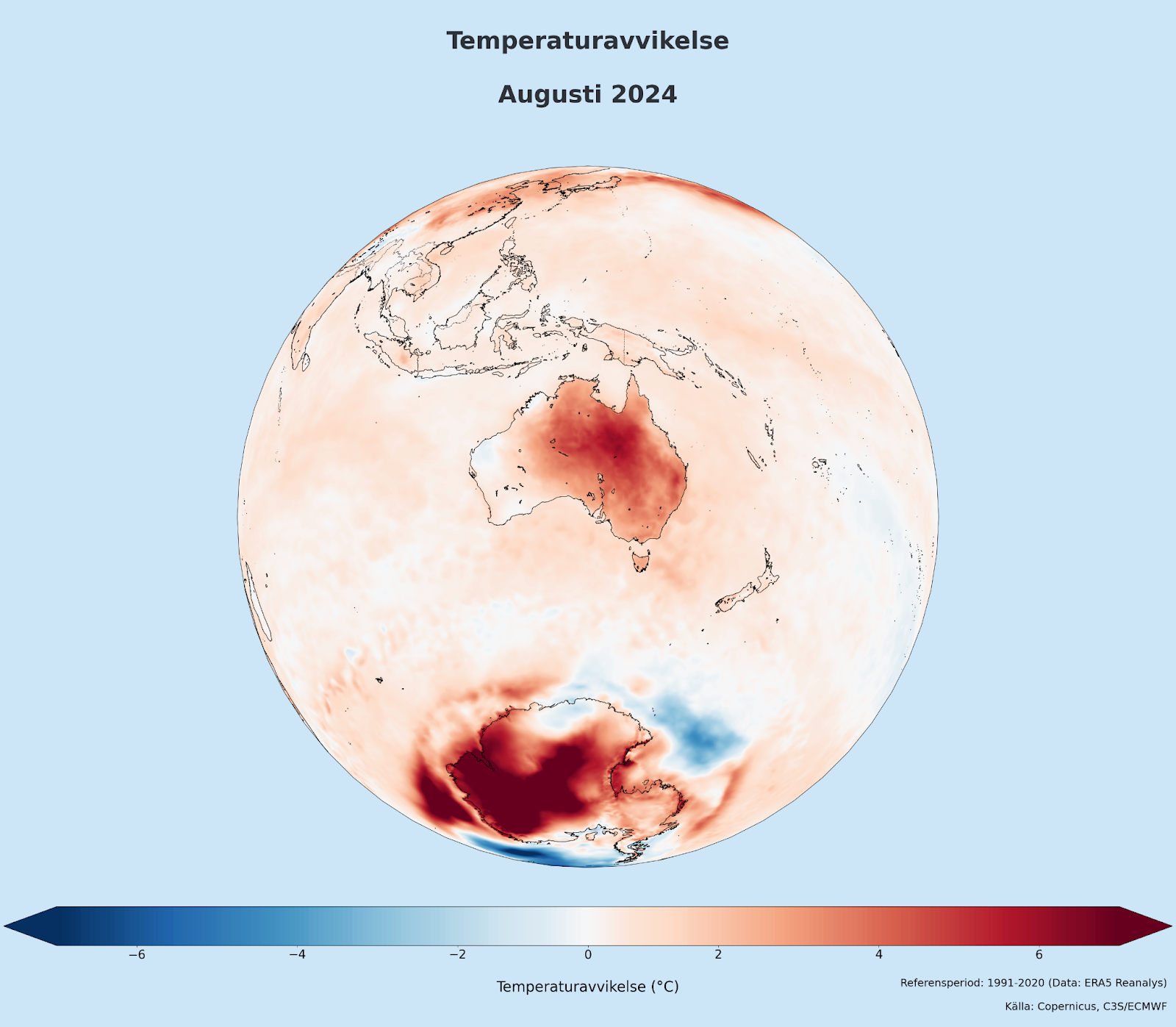 Bilden illustrerar temperaturavvikelsen för augusti 2024 över bland annat Australien och Antarktis - två regioner som innefattar de största avvikelserna. Australien upplevde den varmaste augusti som har uppmätts. Källa: Copernicus/ECMWF.