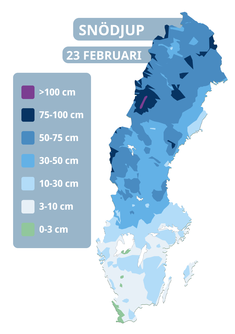 • Det största snödjupet är: 99 cm i Kittelfjäll, Lappland (23 februari) ❄️