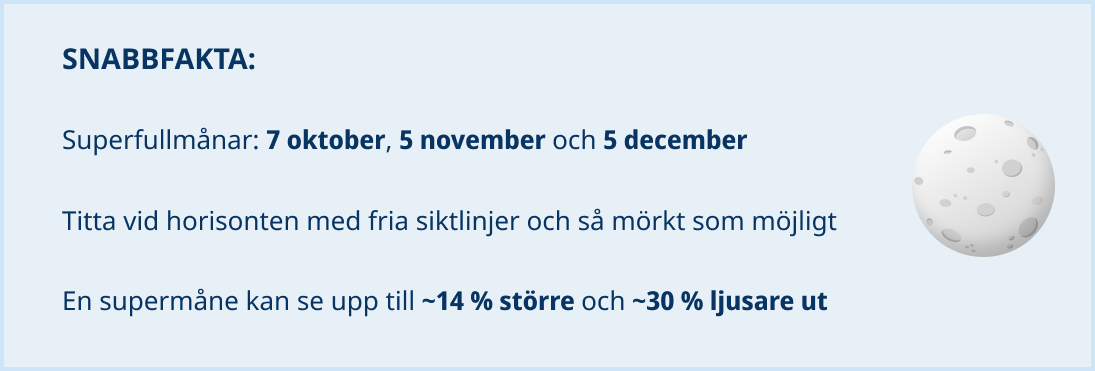 • 7 oktober månuppgång mellan kl.16:45-18:10 (exakt tid skiljer sig mellan orter)