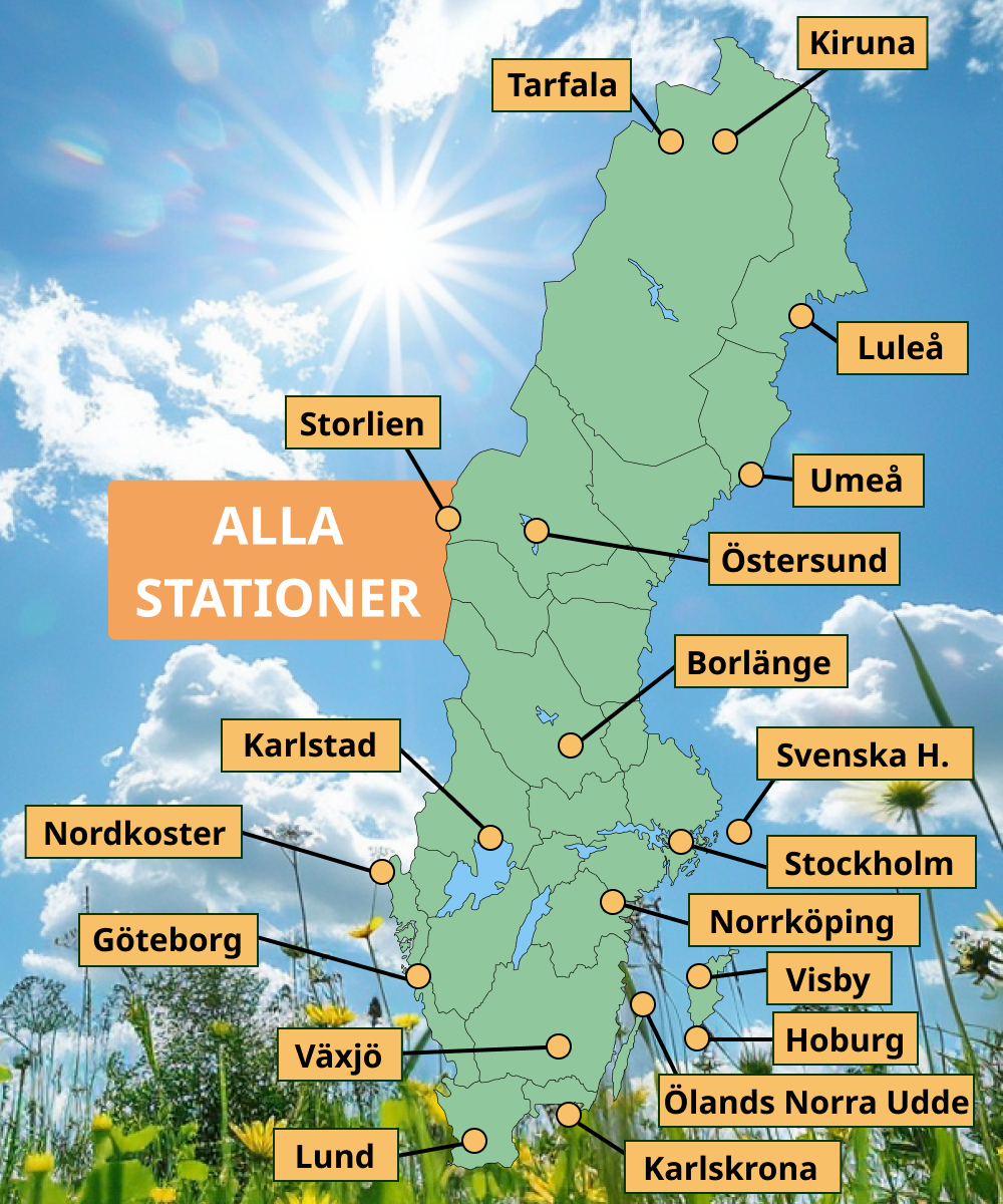 ** Vi har valt att inte ta med Svenska Högarna som ligger en lång bit ut i Stockholms skärgård, där få vistas under hela sommaren och är inte tillräckligt representativ. För området hänvisar vi till väderstationen “Stockholm”.