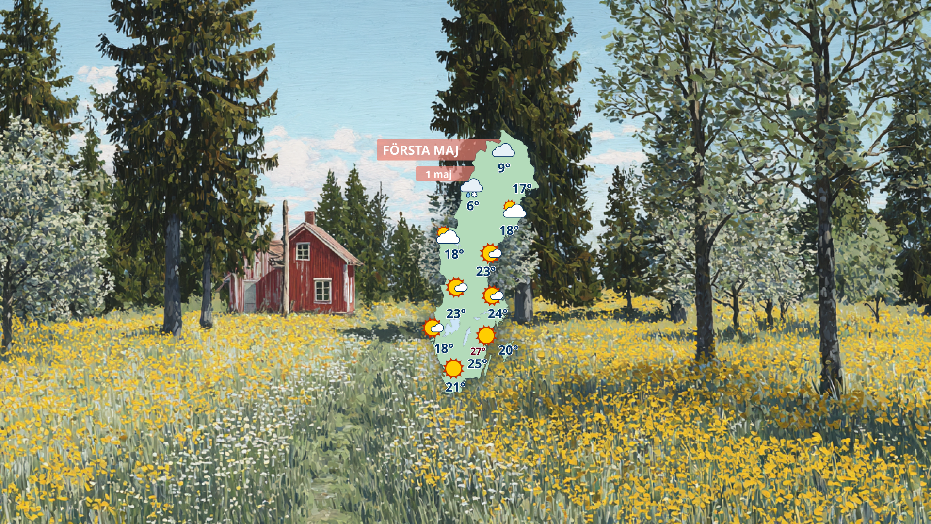 Första maj kan bli första dagen på året med högsommarvärme och alltså 25 grader, lokalt även lite varmare i sydöstra Sverige. I övrigt 15-22 grader, men kallare i fjällen.