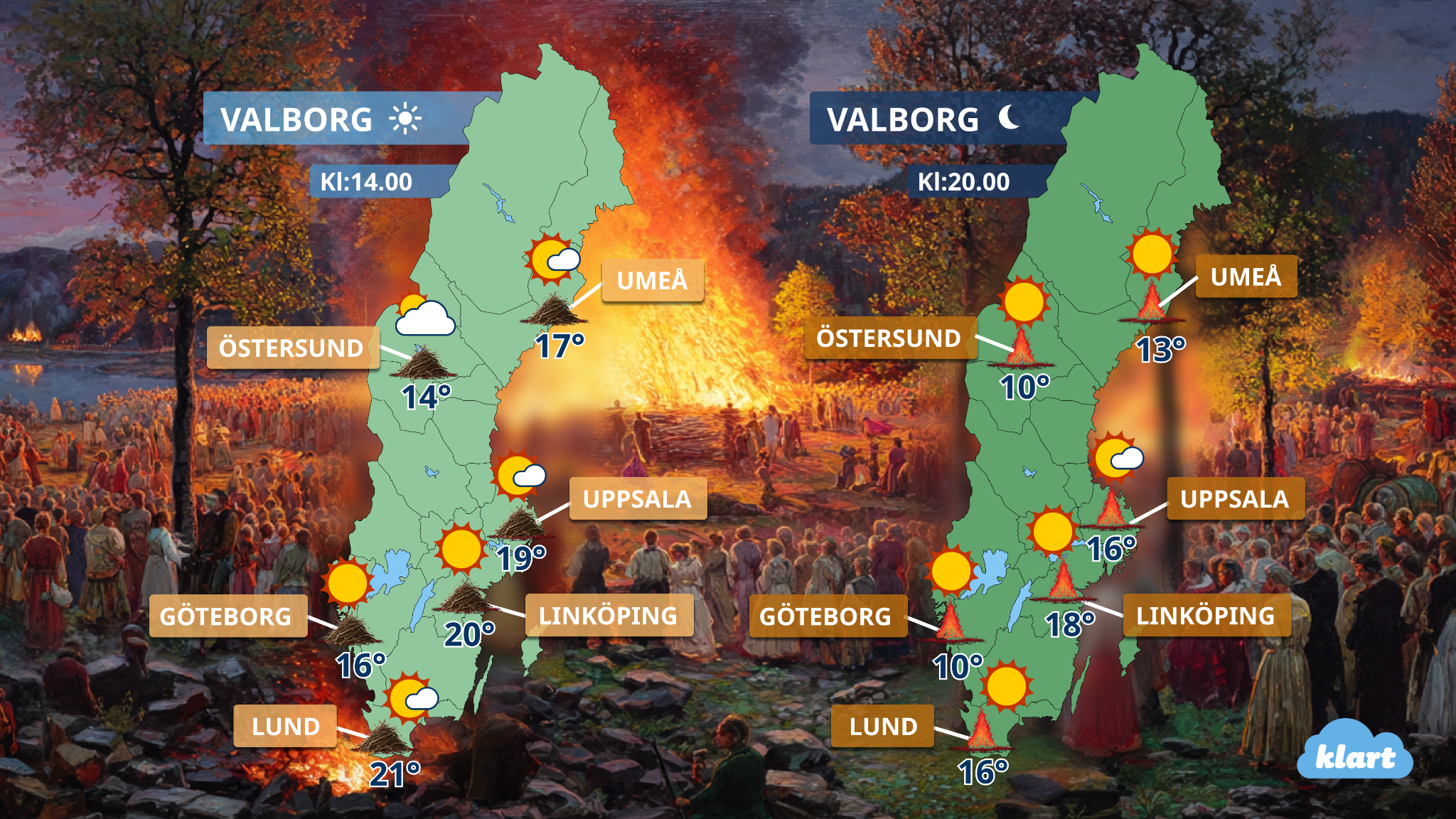 Prognoskartorna, eftermiddag (vänster) och kväll (höger), visar endast ett axplock av orter med valborgsfirande i landet. De små valborgseldarna med temperatur (under) och vädertyp (ovan) markerar olika orter i landet.