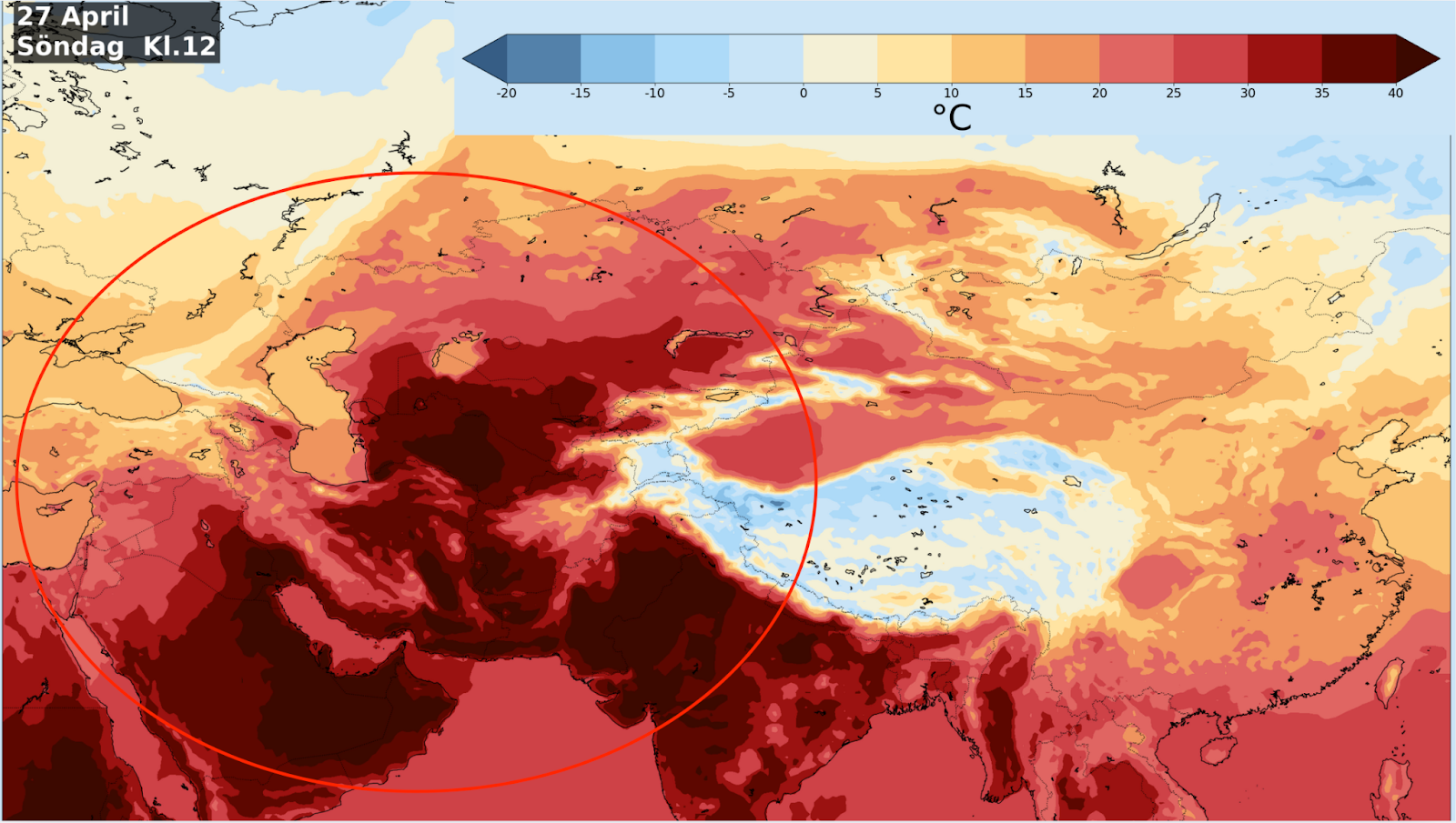 - Afghanistan (Zabol): 44,7 °C – station vid gränsen mot Iran mätte nytt rekord för april.