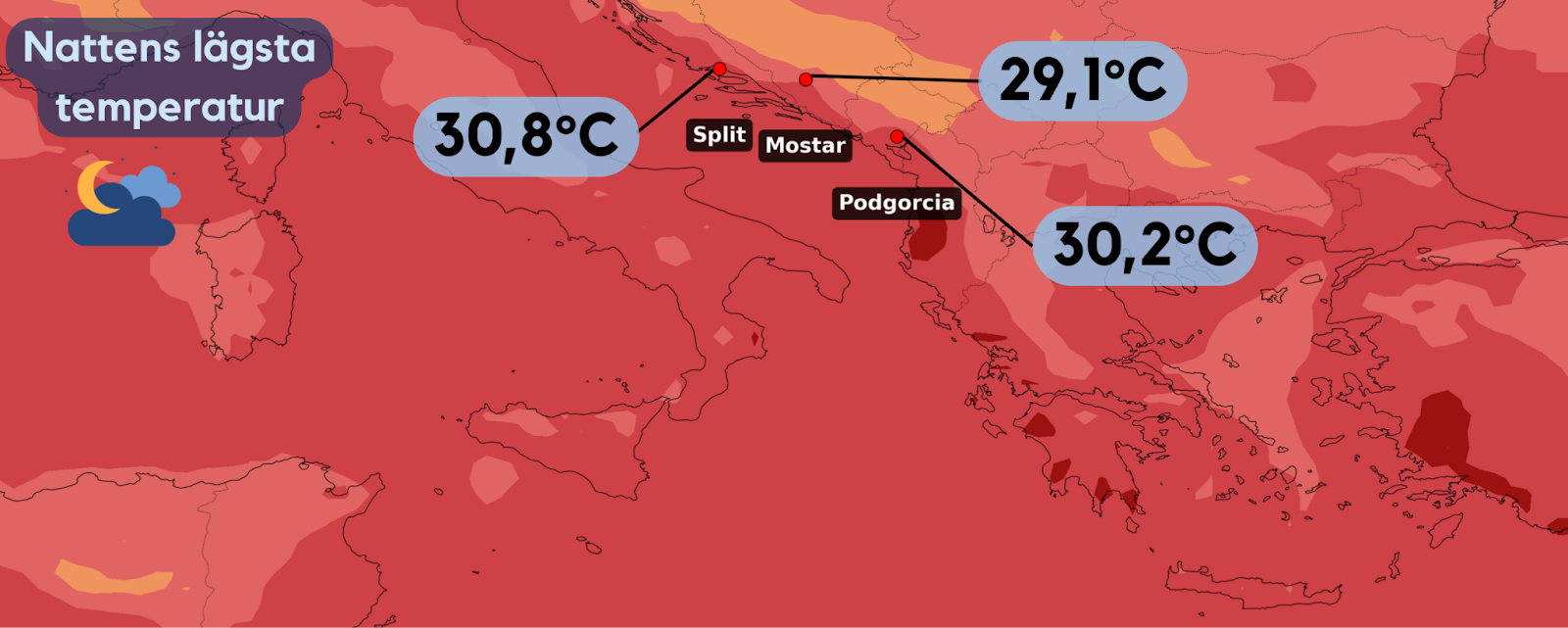 - Bar, Montenegro: 31,8°C – varmast natt som uppmätts på hela Balkan.