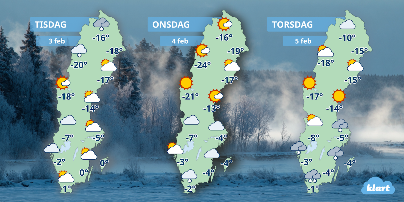 Prognos utfärdad måndagen den 2 februari av meteorolog på Klart.