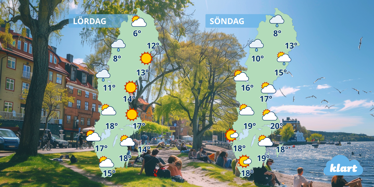 Redan under söndagen så är det varmare luft som drar in över hela landet och det blir upp mot 20 gradersstrecket på flera håll i landets södra halva. Det blir varierad molnighet med godast solchanser i sydvästra Sverige. Längst i norr blir det mer moln och tidvis lättare regn som passerar österut.
