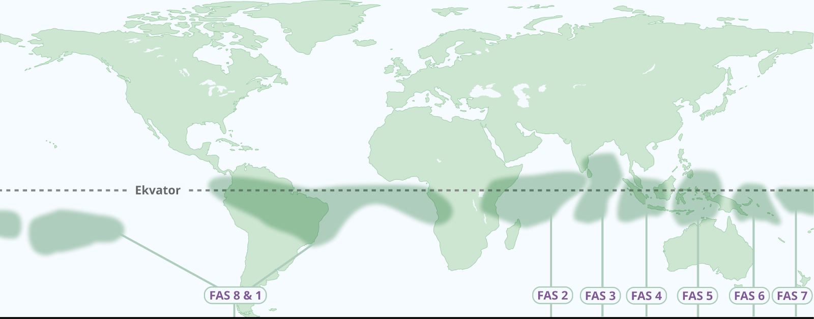 DEN KONVEKTIVA FASEN: Bilden illustrerar genomsnittlig nederbörd vid MJO som förekom mellan 1979-2012 för alla faser under perioden november-mars. De gröna områdena indikerar nederbörd över genomsnittet och alltså utbredningen av förstärkt konvektiv aktivitet (skurbetonat väder). Notera den tydliga förskjutningen österut mellan varje fas.