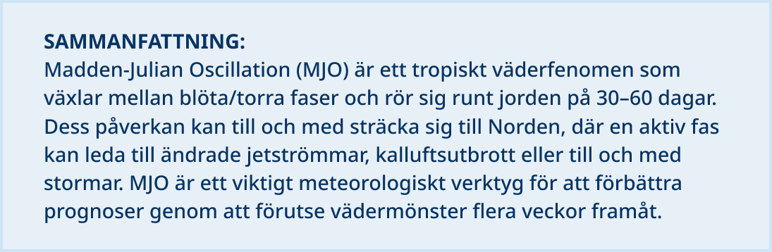 - Under vintern kan en aktiv MJO-fas påverka stormsystemen i Nordamerika och Europa, vilket leder till förändringar i jetströmmen och möjligheten till kraftiga kalluftsutbrott eller stormar.
