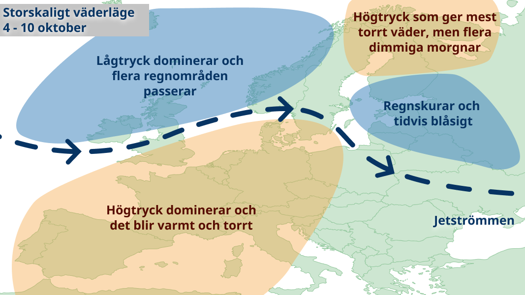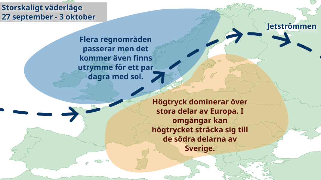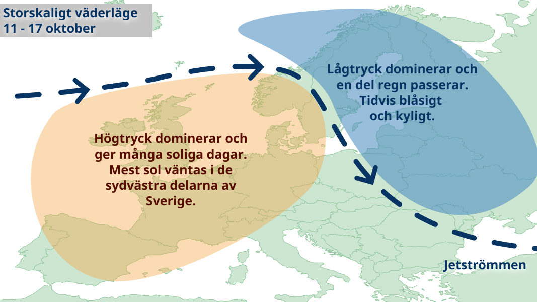 Sverige hamnar troligen norr om jetströmmen denna vecka vilket brukar leda till svalt väder. I norr 5-10 grader och i söder 10-15 grader. Vädret kommer dock variera en hel del i både söder och i norr. Lågtryck för in regn över landets nordvästra delar och skurar bildas framförallt i Östersjölandskapen. Längst i söder kan någon högtrycksrygg nå in med sol och värme, medan högtrycket längst i norr istället ger kyliga dagar med nattfrost och dimma.