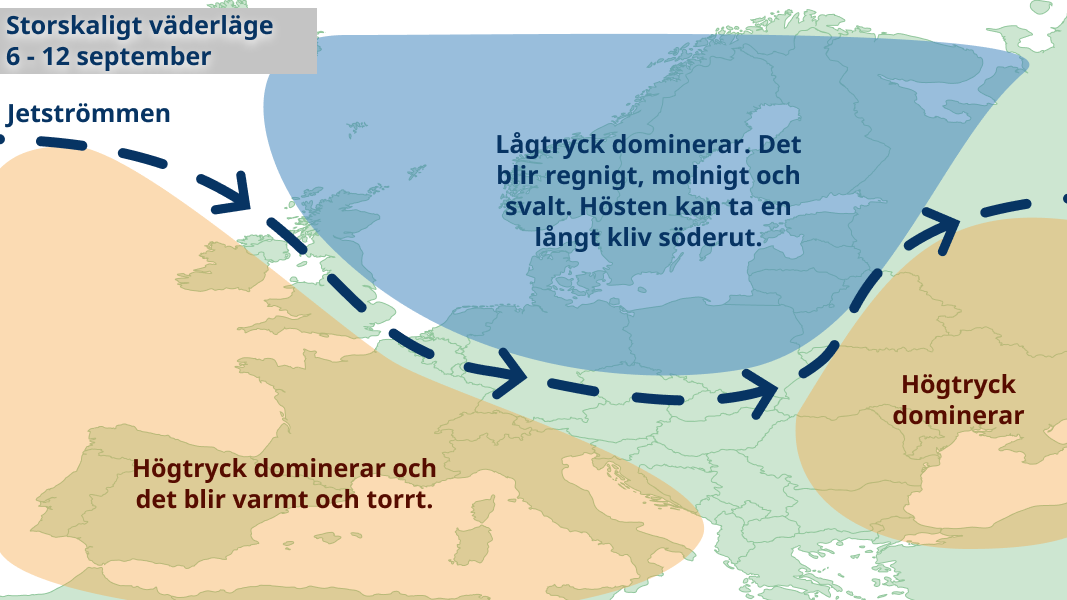 Väderläget från föregående vecka står sig till stor del med flera lågtryck som når in från väst och för med sig regn, blåst och mycket moln. Det väntas bli allmänt 10–15 grader och något kyligare längst i norr och i fjällen. Emellan regnområden kan det såklart finnas utrymme för soligt väder, men den sydliga jetströmmen indikerar att det inte blir någon sommarvärme, istället kan den meteorologiska hösten ta en kliv söderut över Norrland och kanske även Dalarna.