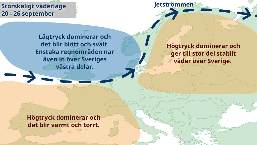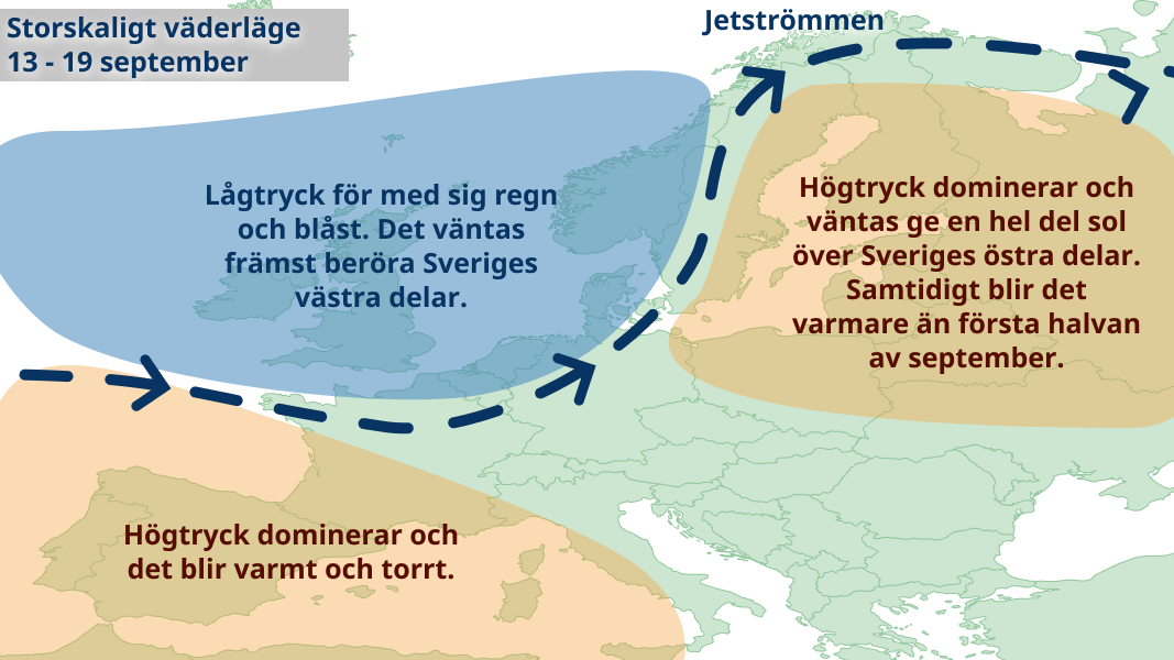 Under mitten av september börjar troligen högtryck etablera sig över Baltikum vilket leder till att sydliga eller sydvästliga vindar når upp över Sverige. Varmare luft når då stora delar av landet och i de östra delarna kan högtrycket i öster bidra till soliga förhållanden och eventuellt temperaturer på drygt 20 grader. I väster fortsätter dock regnområden nå in men även där blir det successivt varmare och torrare under andra halvan av september.