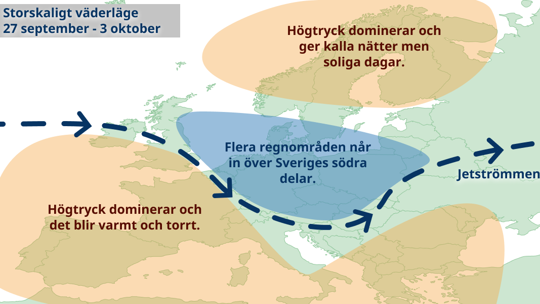 I månadsskiftet september till oktober kommer troligen en del regnområden nå in över de södra delarna av Sverige. I de norra och mellersta delarna av landet kommer troligen ett högtryck etablerar sig vilket leder till frostnätter och soliga dagar, men temperaturerna blir troligen blygsamma i både söder och i norr.