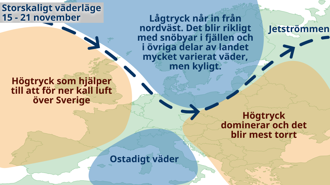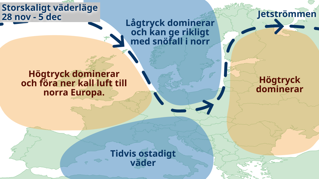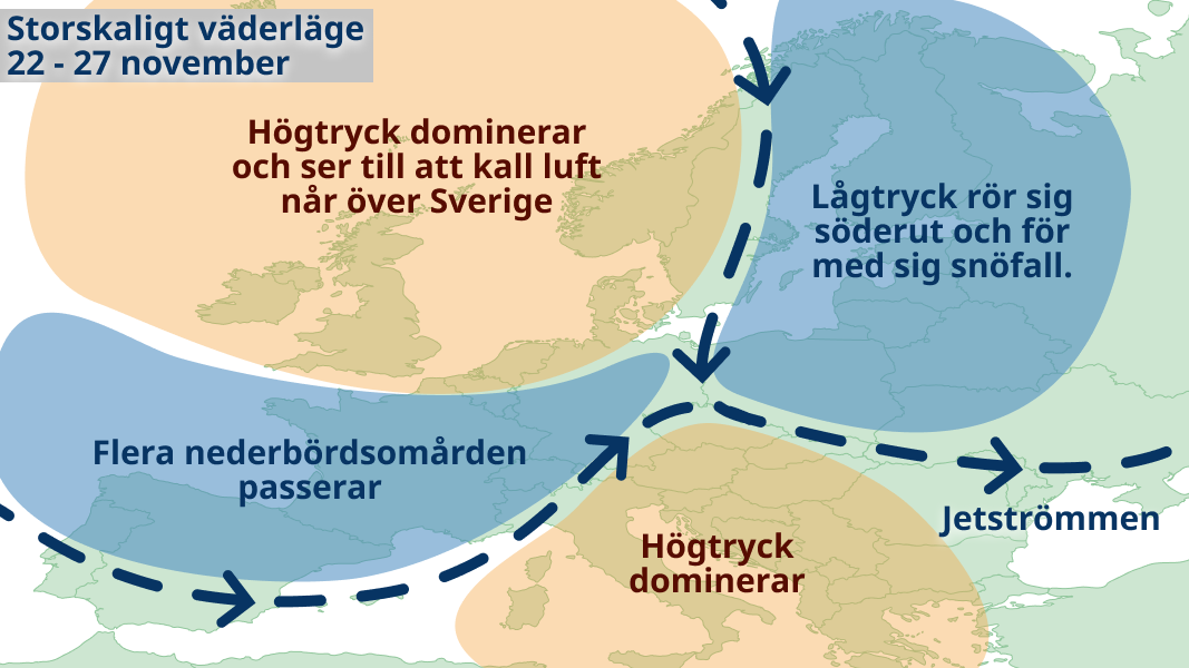 Den meteorologiska vintern tar troligen ett stort kliv ner över landet denna vecka när högtryck etablerar sig över Skandinavien. I den nordliga vinden väntas sol varvas med moln i stora delar av landet, men längs Norrlandskusten och i Östersjölandskapen blir det troligen mer moln och en del snöbyar, eventuellt i form av så kallade snökanoner som kan ge lite större mängder. I söder kommer temperaturen ligga omkring nollan de flesta dagarna och i norr 5-10 minusgrader och ännu kallare i fjällen.