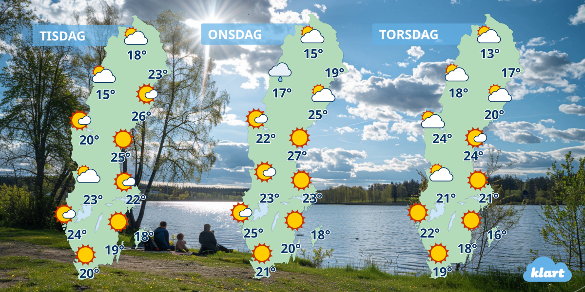 Om vi inte slår nytt årshögsta redan under måndagen, så lär vi göra det på tisdag med över 25 grader både i Svealand och östra Norrland. En hel del sol dessutom och 19-24 grader, men svalare i nordväst och även i Östersjölandskapen i samband med pålandsvind.